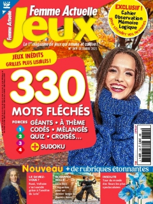 Tous les mois, plongez dans plus de 130 pages de jeux : sudoku, mots fléchés, mots mélangés, à placer, anagrammes, quiz, mots codés, mots croisés etc… Détente et gym du cerveau assurées !