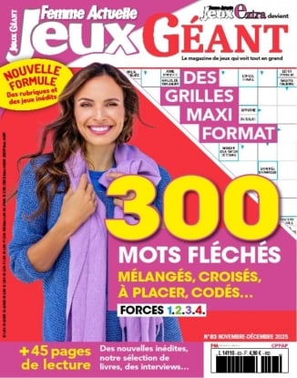 Femme Actuelle Jeux Géant, c'est de la lecture et des jeux ! Découvrez des mots fléchés par niveau, des mots fléchés à thème, des mots codés, des mots croisés, des mots à placer, des mots mélangés et des anagrammes ! En bonus : retrouvez 40 pages de lecture dans lesquelles vous découvrirez des destins extraordinaires ! A vous de jouer !